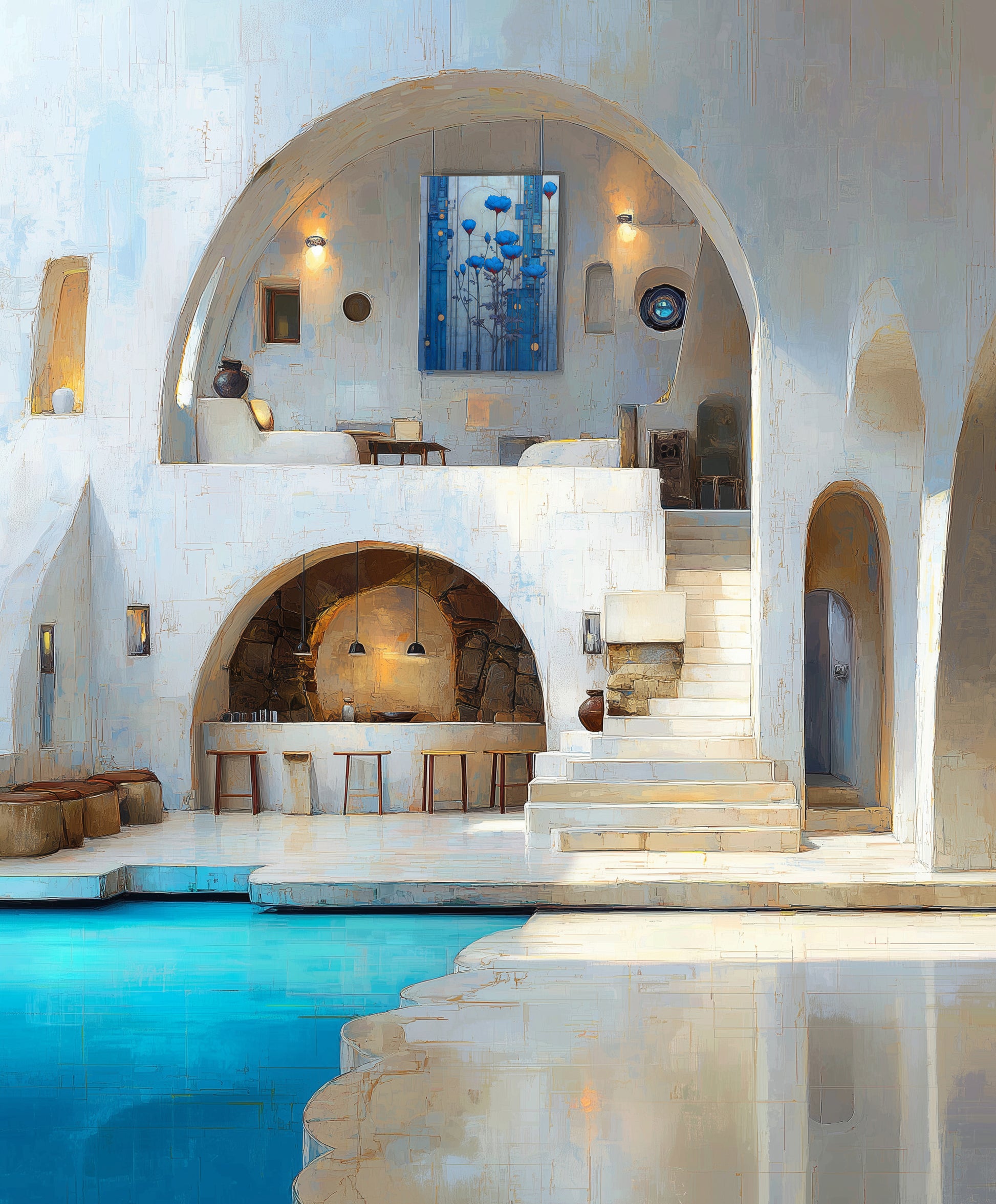 This piece imagines a future in which nature and technology were never divided. The flowers rise like offerings from a forgotten Aegean civilisation, growing through an architectural surface that feels both ancient and engineered. Rather than being overtaken by machines, the organic form becomes the organising principle, threading life through geometry, ritual and structure.