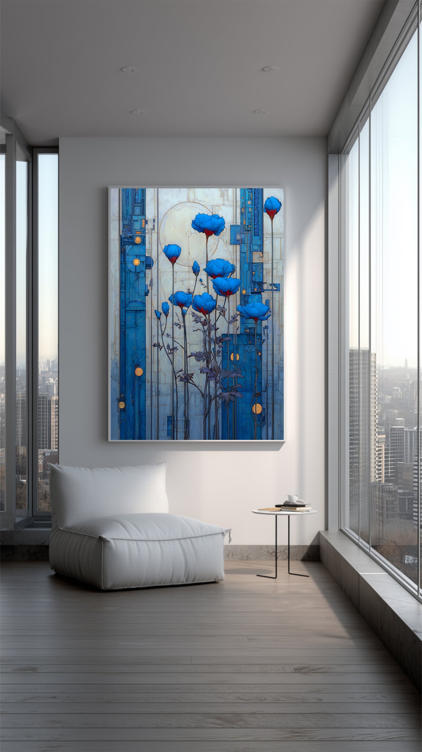 This artwork features tall blue blossoms with deep red centres, emerging from a layered, architectural backdrop of pale stone tones and Aegean blues. The background is composed of subtle panel lines, circular motifs and fine technical detailing, evoking circuitry, temple walls and schematic drawings at once. The flowers remain soft and expressive, creating a striking contrast between organic fragility and structural precision.