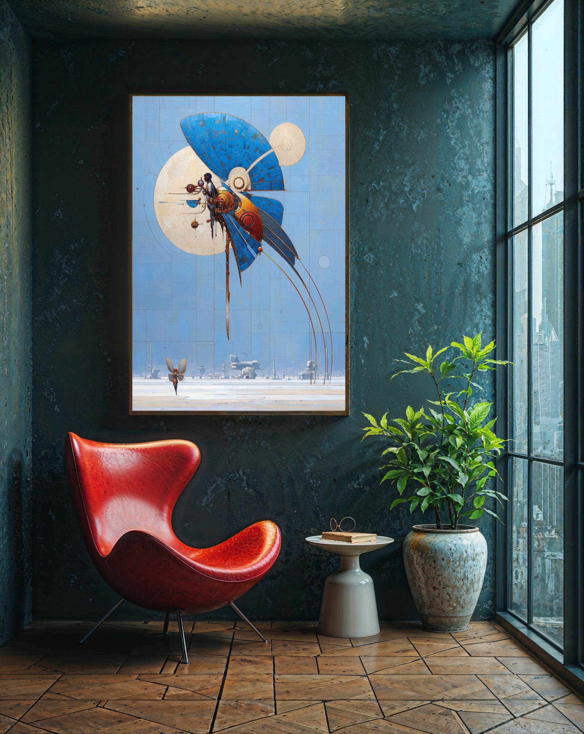 This piece belongs to a wider visual language that merges Mediterranean calm, sacred geometry, and speculative futurism. It feels less like a machine and more like a guardian or messenger, suspended between eras, watching over a world shaped by both memory and innovation.