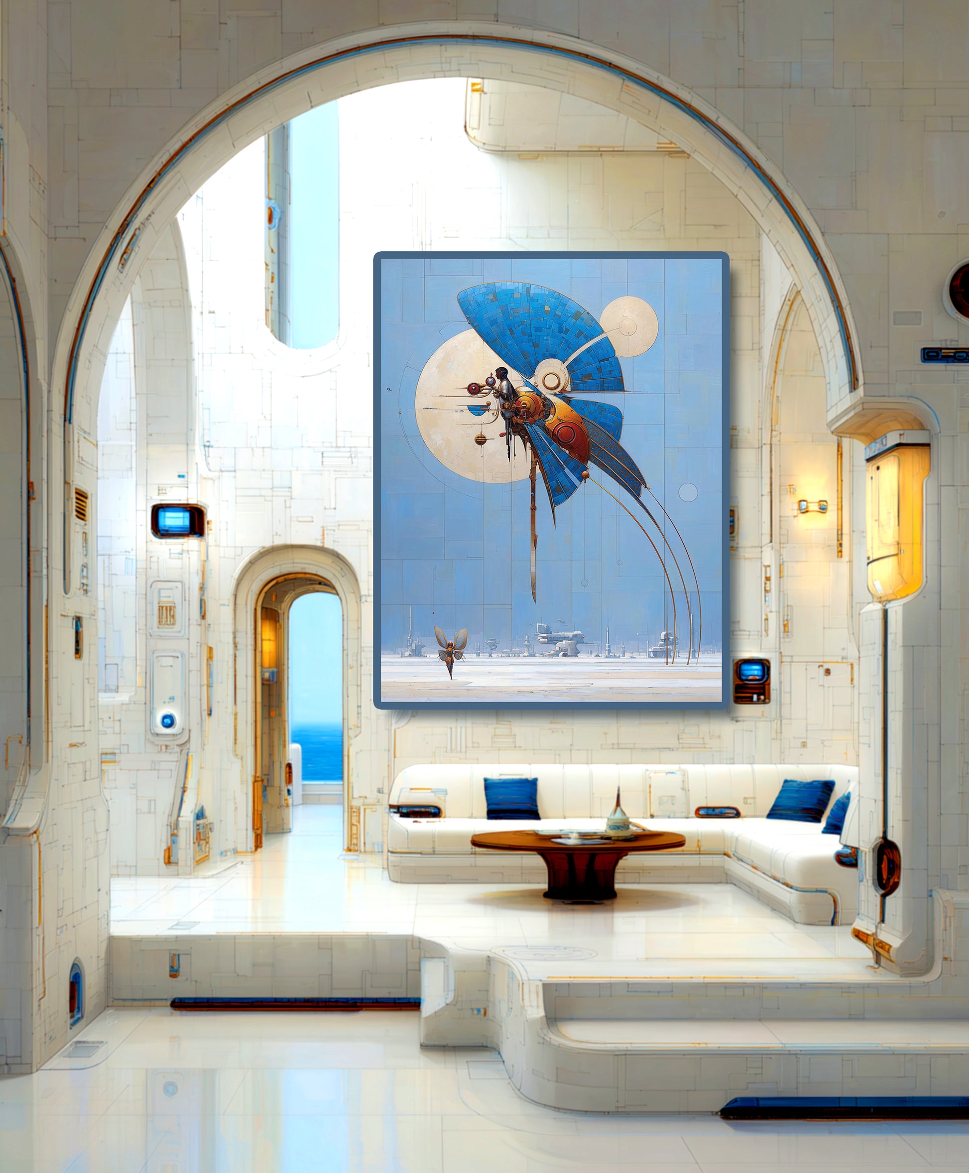 This large-format wall art print presents a striking fusion of Aegean colour theory, architectural minimalism, and advanced technological form. Dominant Mediterranean blues are layered with soft stone whites and restrained accents of warm gold, creating a composition that feels expansive, serene, and quietly powerful.