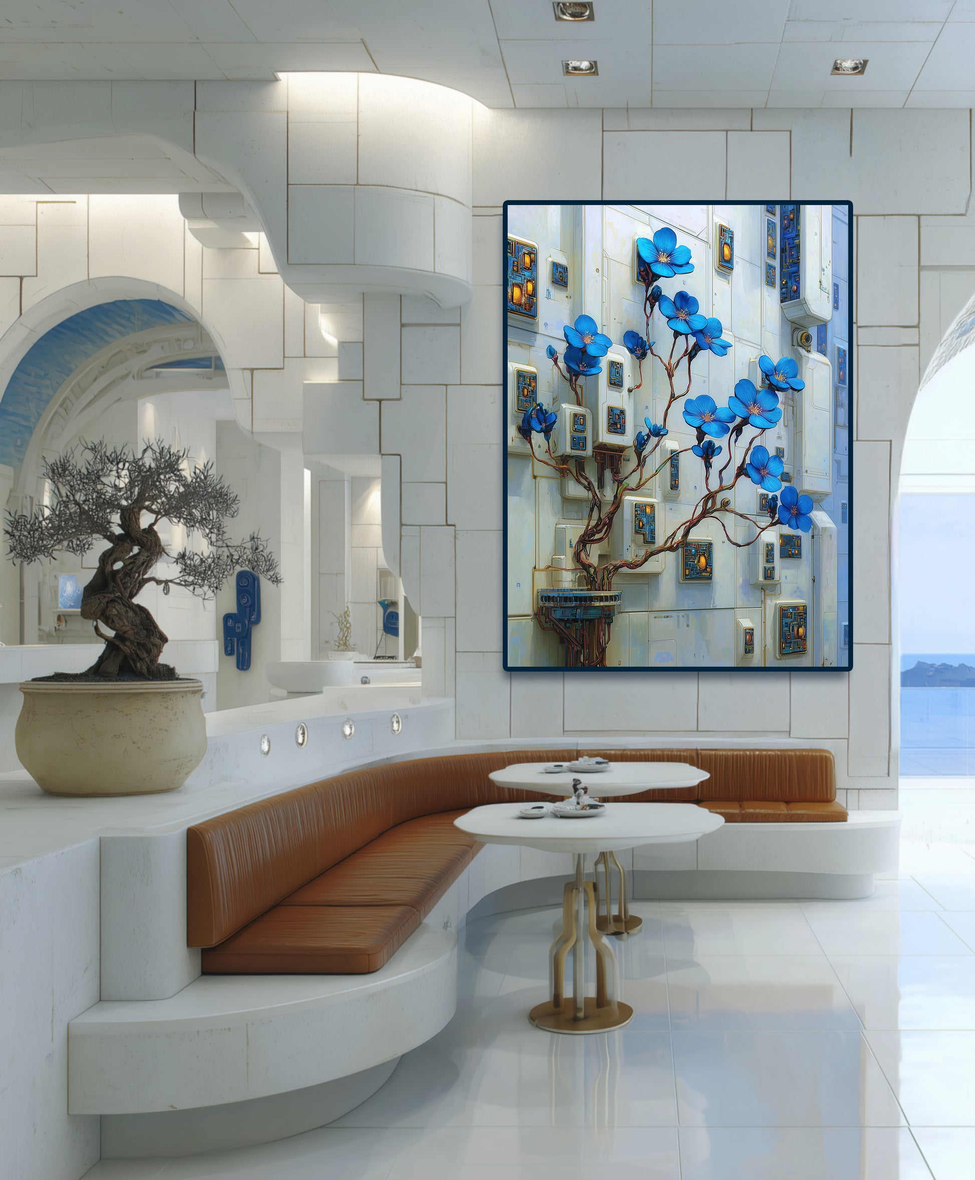 Blue Circuit Bloom is a quiet vision of nature re-emerging within a future built by precision and code. Delicate blue flowers grow directly from a pale architectural surface, their stems threaded through panels, ports, and embedded systems as if the wall itself has learned how to cultivate life. The piece imagines a world where technology no longer dominates nature, but becomes its silent infrastructure — unseen, supportive, and calm.