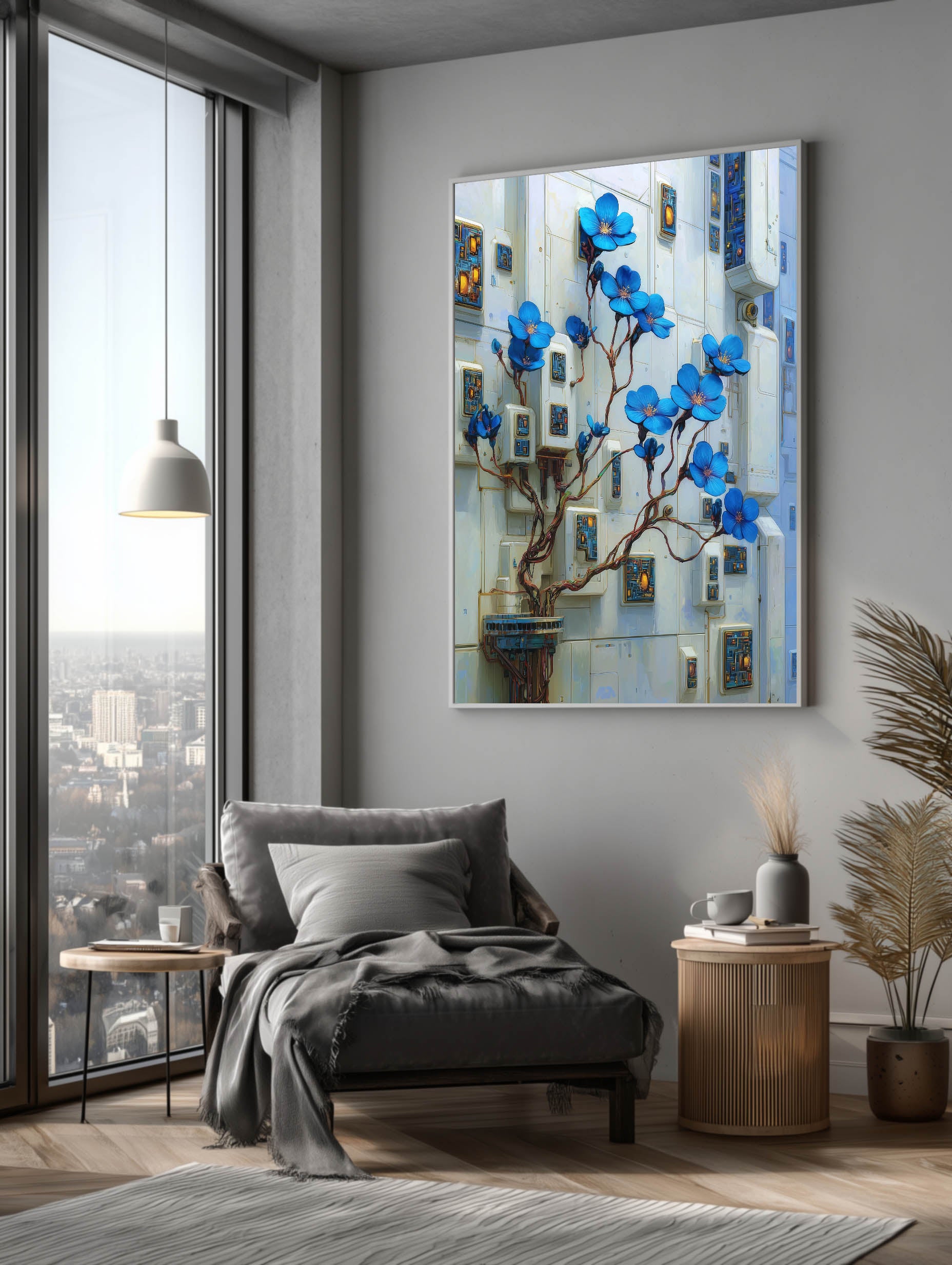 This large-format futuristic wall art print is produced as a 70 × 100 cm fine art piece on Hahnemühle Photo Rag, chosen for its soft matte surface, exceptional colour depth, and museum-quality finish. The paper enhances the layered textures of the architectural forms while allowing the vivid blue florals to remain luminous without glare.