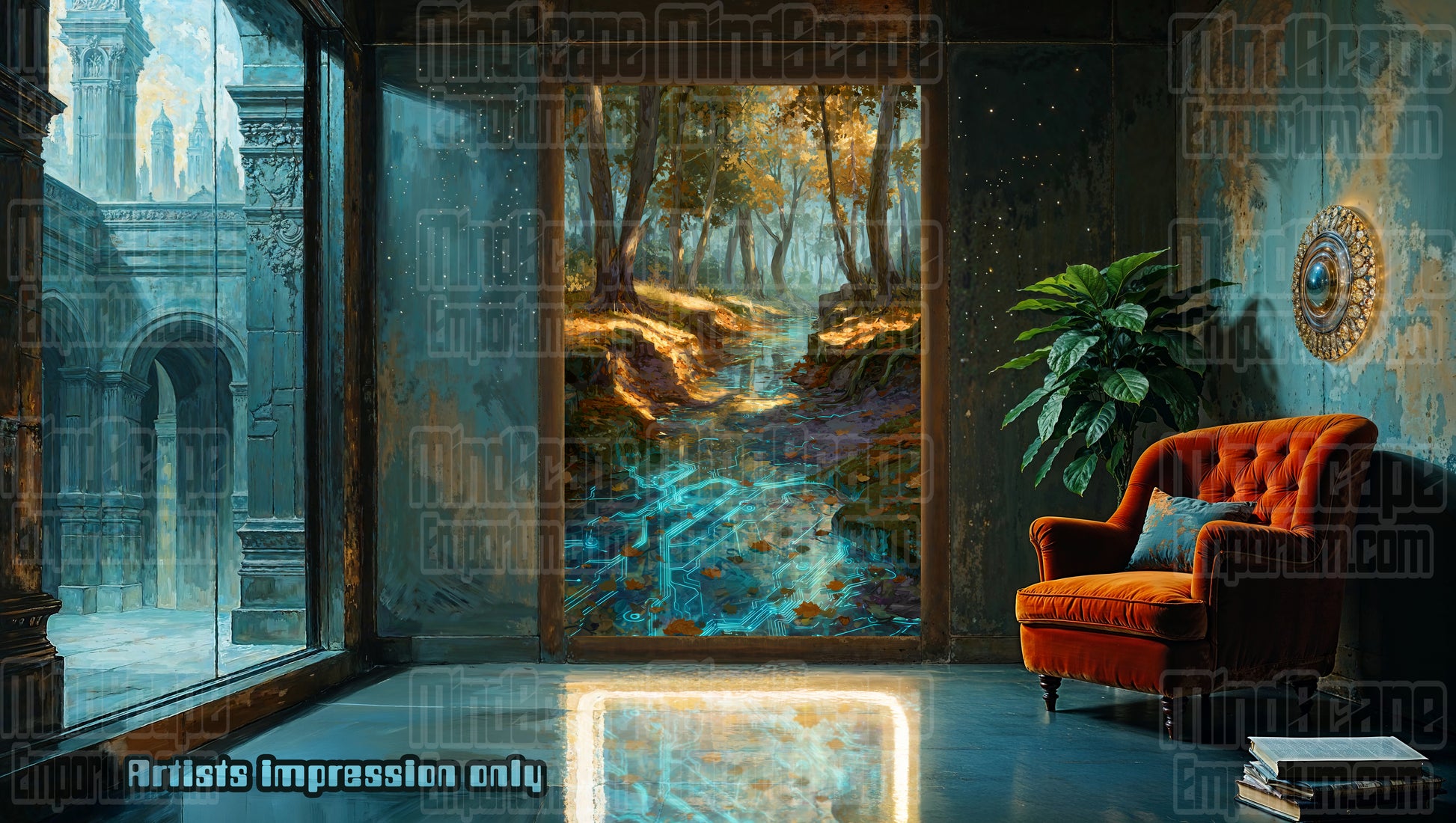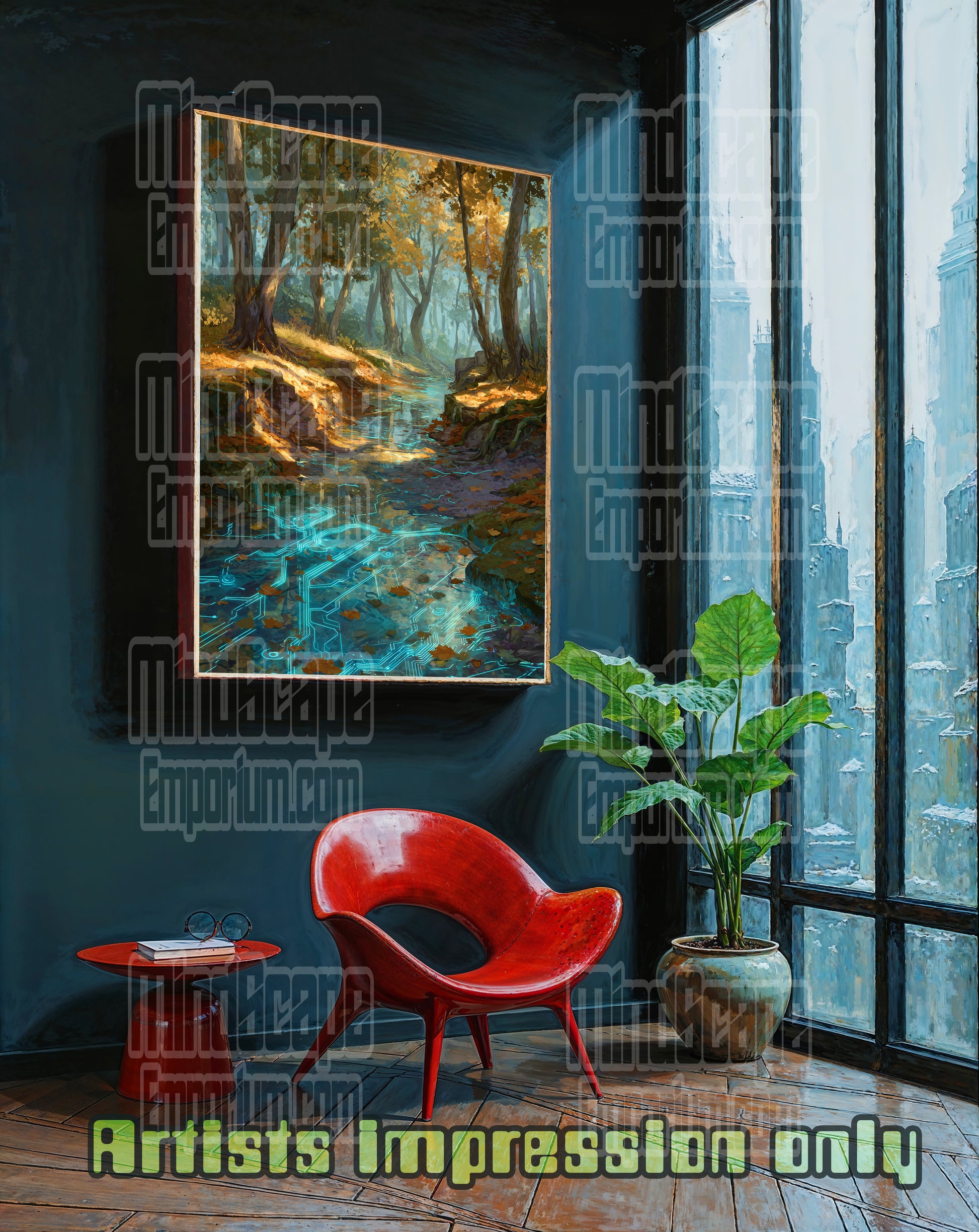autumn forest print, circuit stream art, futuristic nature decor, glowing creek, digital landscape, sci-fi wall art, golden leaves artwork, high-tech nature, modern forest art, tranquil wall decor, visionary art print, unique home decor, cyber nature, tech-inspired artwork, fall scenery print.#mindscapeemporium