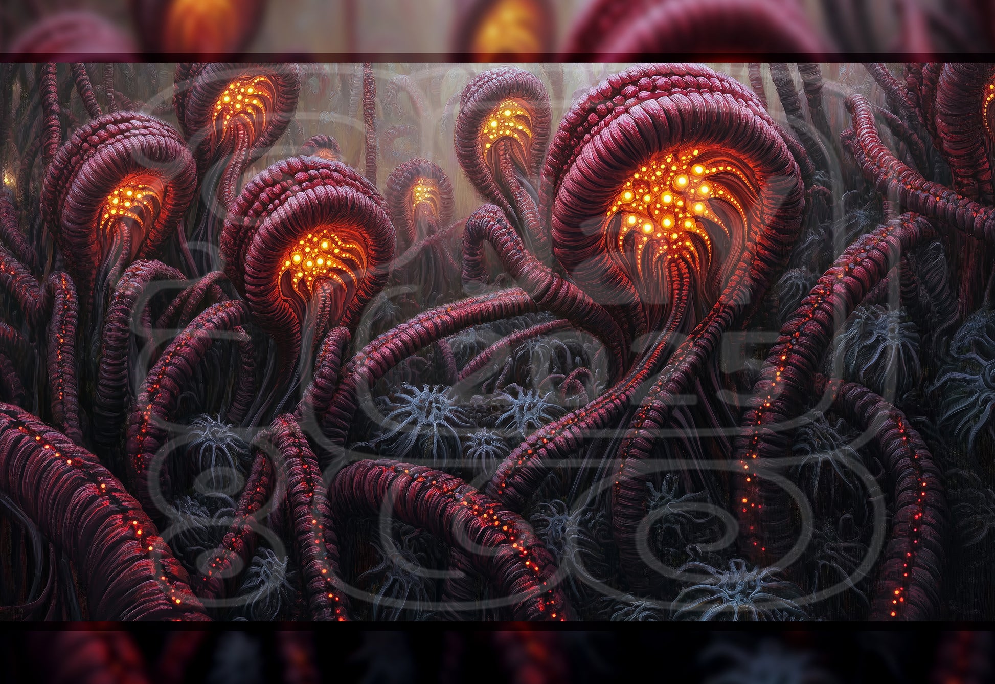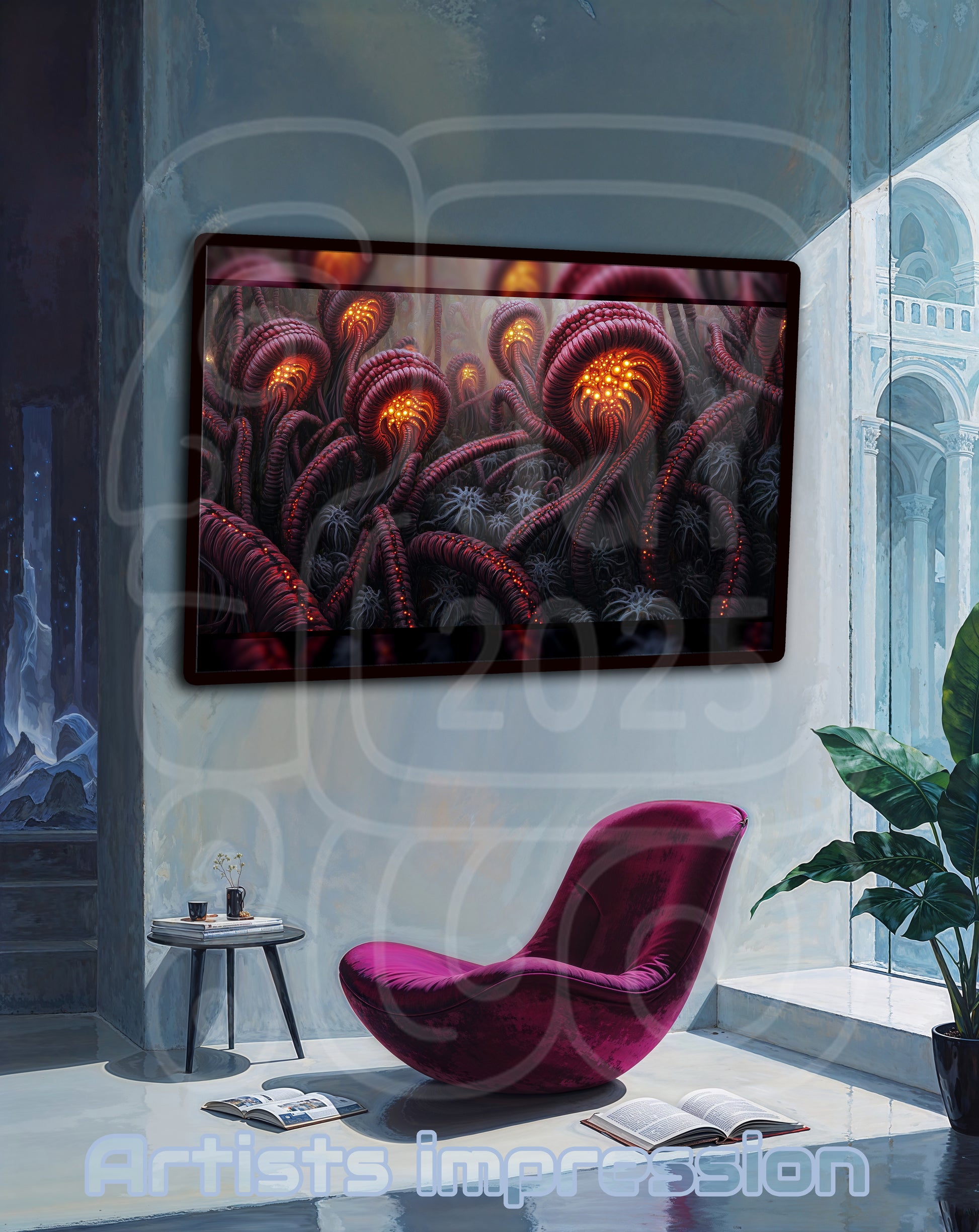 Venture into the surreal world of Glowroot Forest, where alien plant life glows with hypnotic light. Twisting roots and tentacled forms pulse with vibrant orange luminescence, casting an ethereal glow across the shadowy undergrowth. This striking art print blends sci-fi wonder with the beauty of the unknown, drawing you into a mysterious, otherworldly landscape.