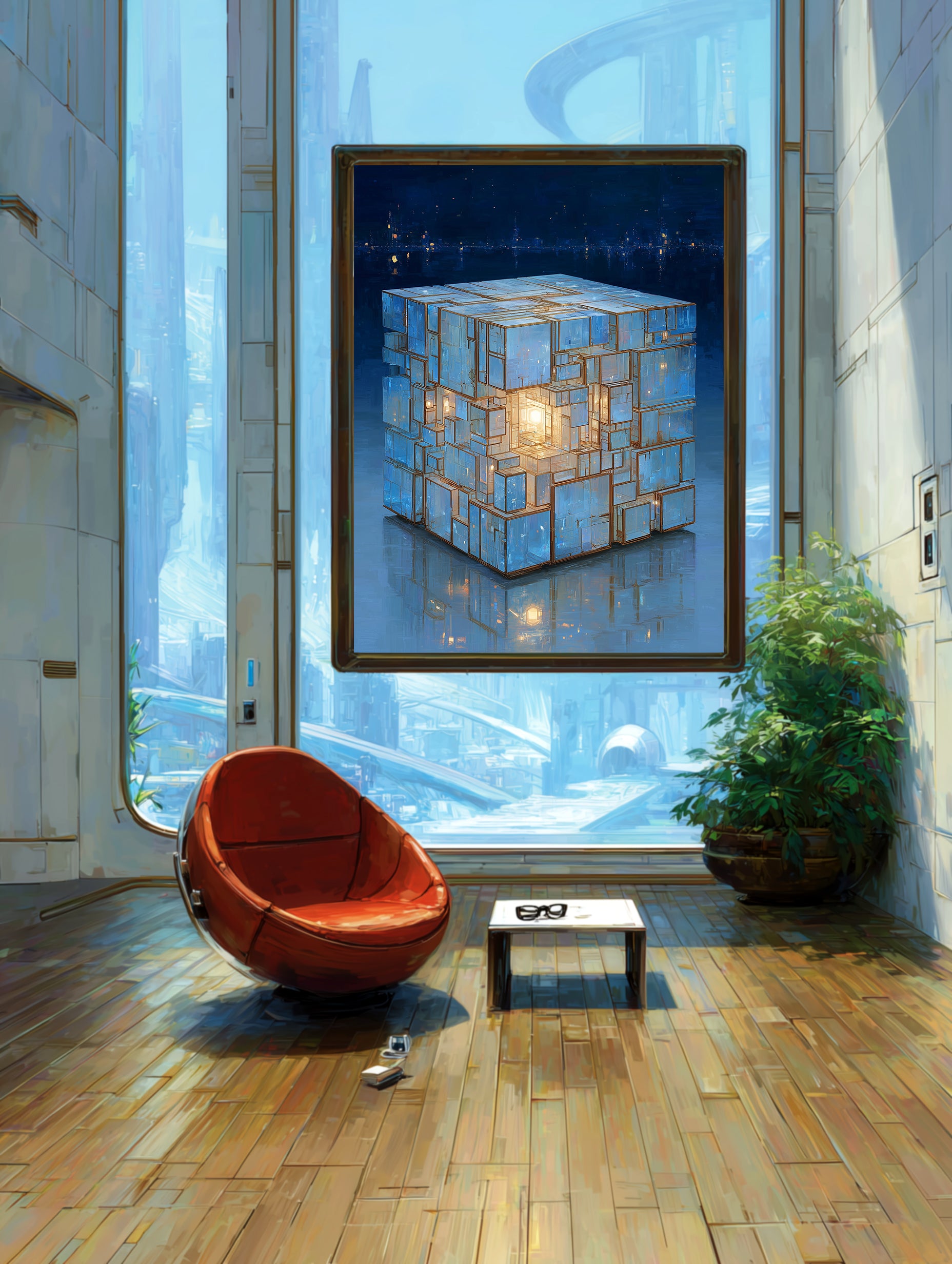 This work imagines a civilisation that built its monuments from light rather than stone. The cube stands as a sealed archive, its outer structure calm and restrained, while a warm inner core glows from within. It suggests knowledge preserved, energy contained, and intention hidden beneath precision. The piece sits between relic and prototype, as if discovered rather than designed.