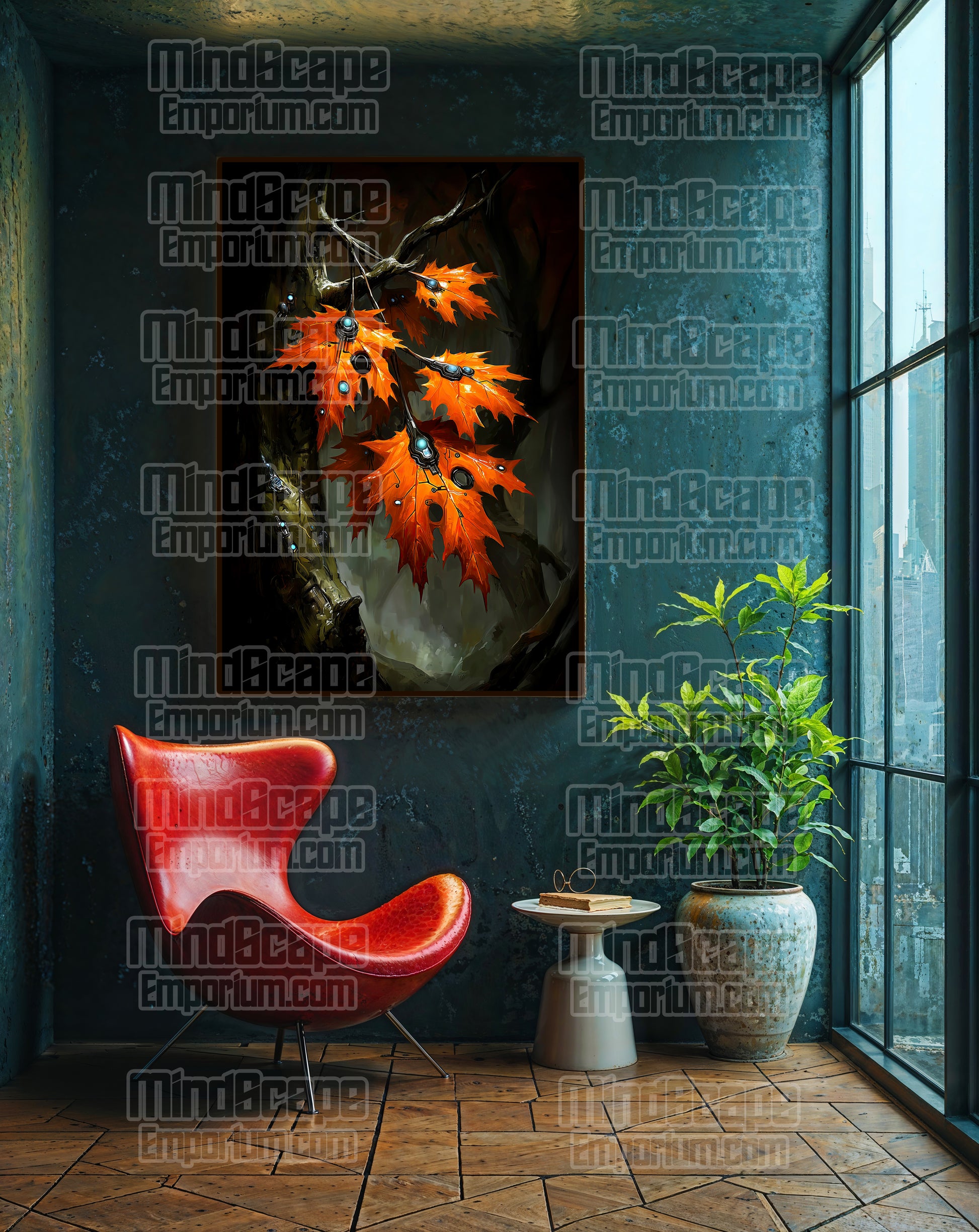 cyberpunk autumn art, maple leaf print, futuristic nature decor, techno-organic wall art, sci-fi leaves, glowing orange artwork, modern fall print, circuit art, digital nature, abstract botanical, visionary art, unique home decor, fantasy forest, high-tech foliage, synthetic botanical art.#mindscapeemporium