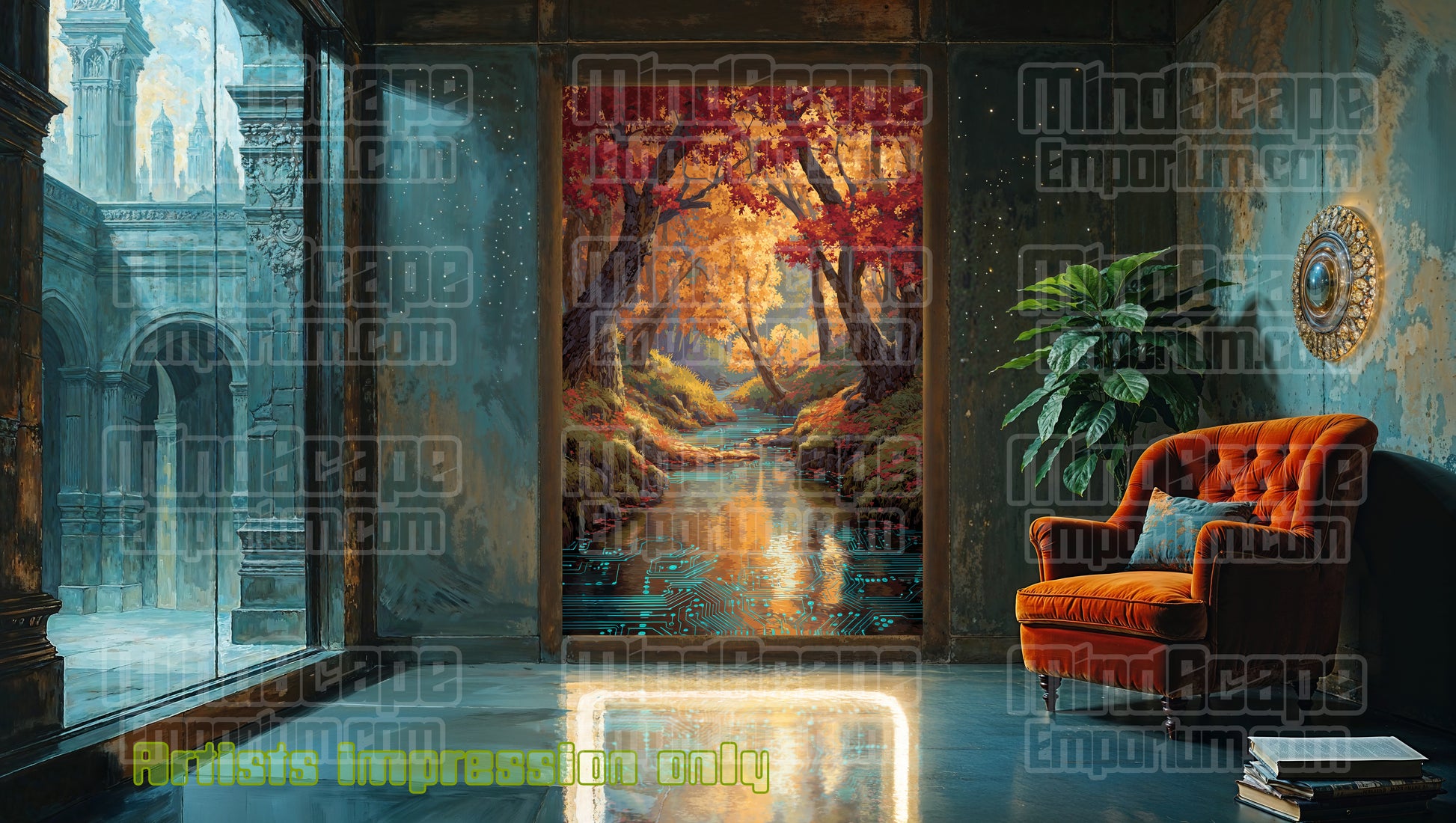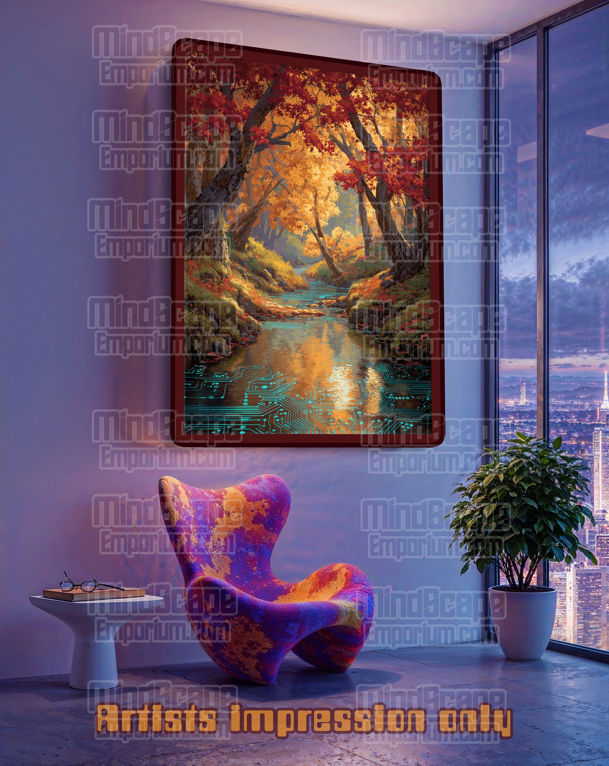 autumn forest art, digital nature print, cyber creek, circuit river, futuristic landscape, golden fall decor, modern wall art, high-tech forest, sci-fi landscape, nature and technology, glowing creek, visionary artwork, unique home decor, tranquil tech art, autumn trees print,#mindscapeemporium